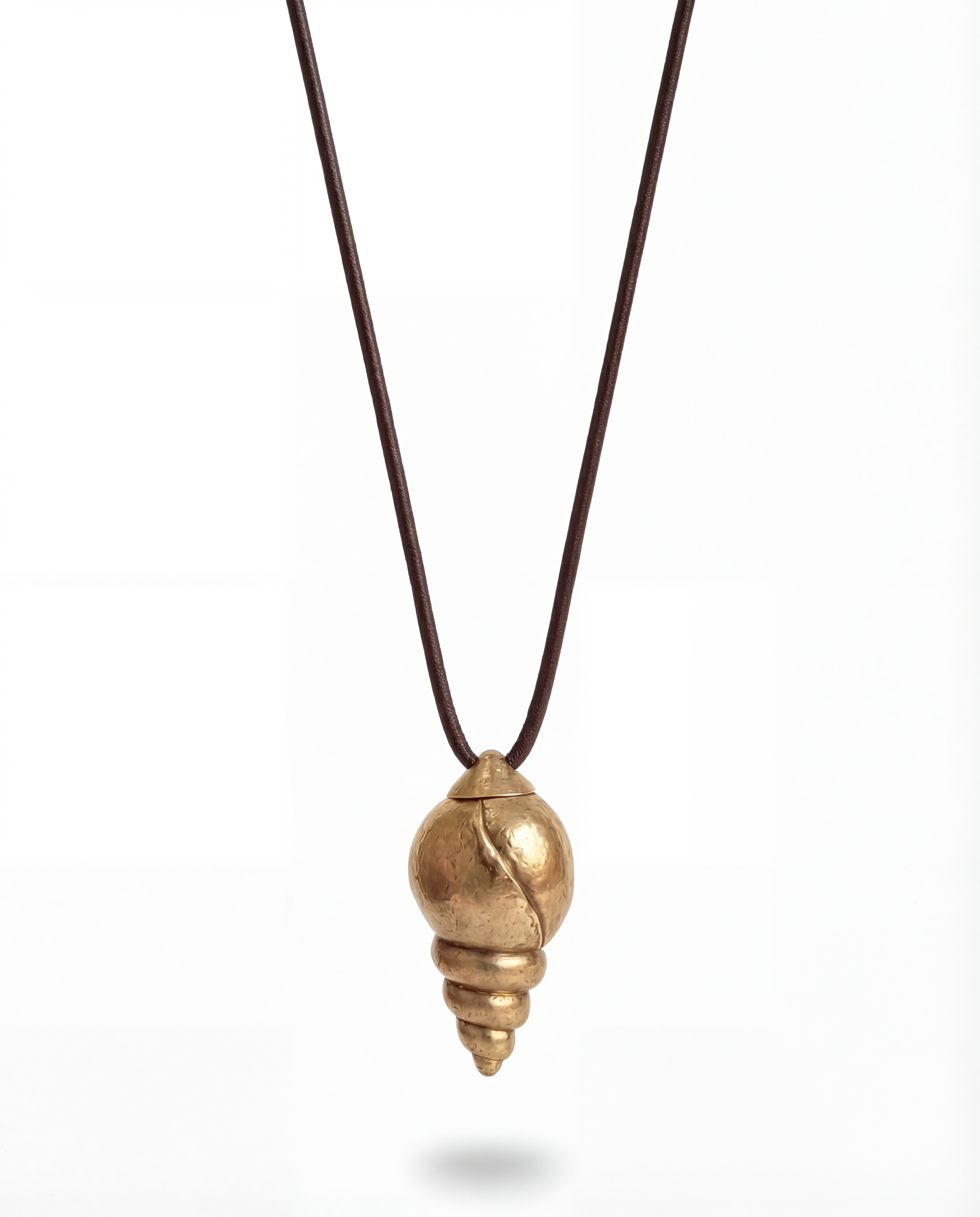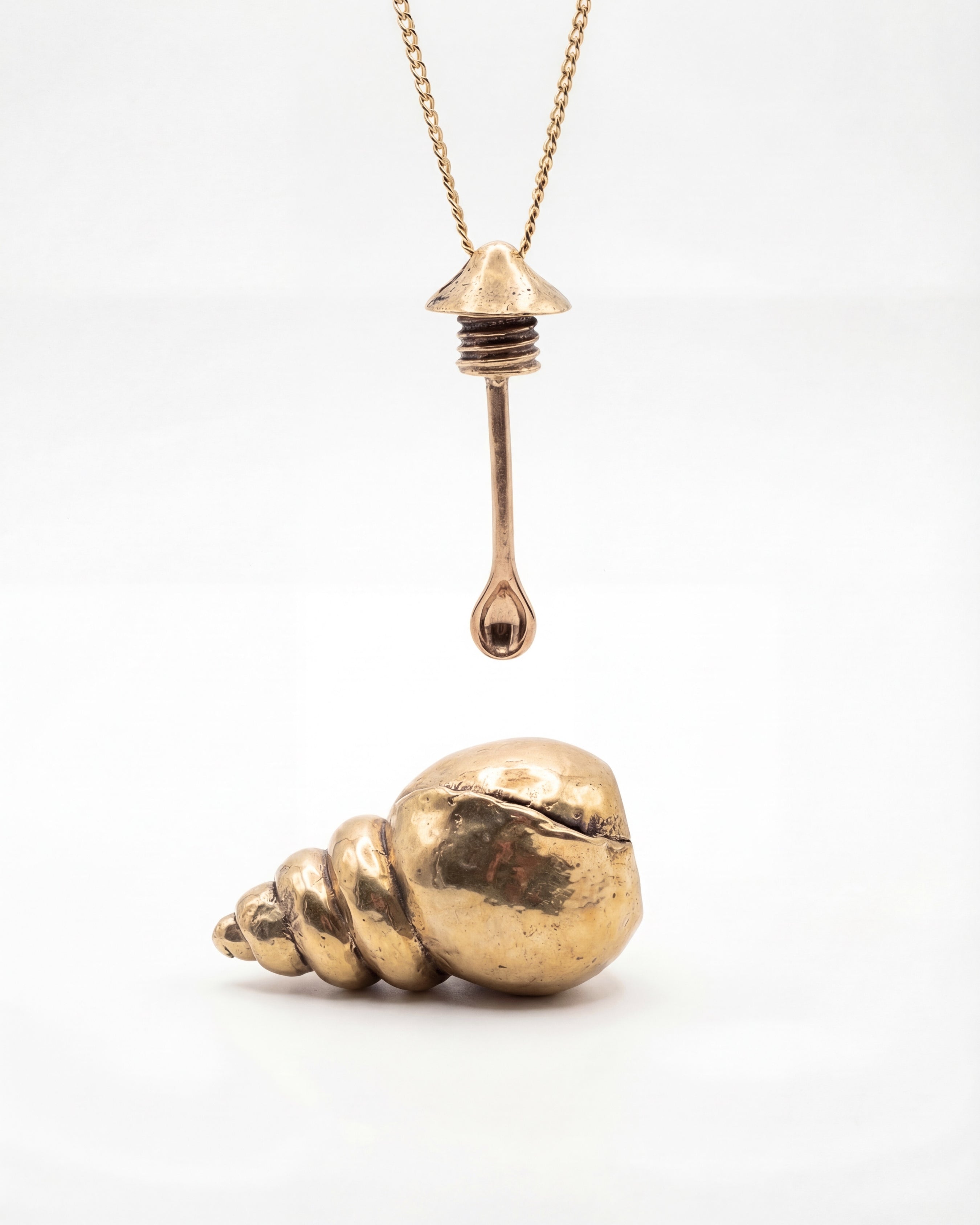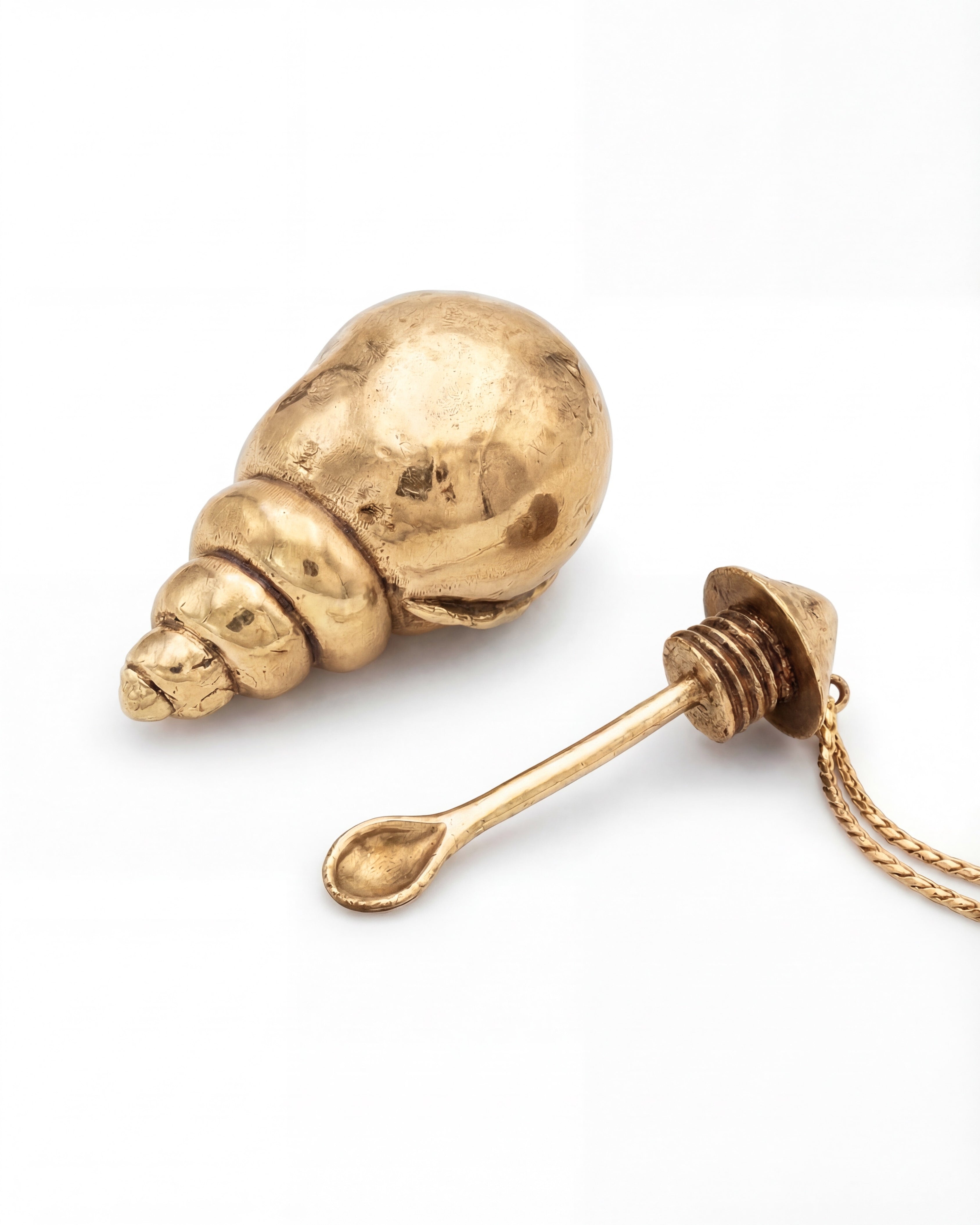 Handmade in solid brass and finished in gold or silver, this shell necklace opens to reveal a discreet hidden spoon. Designed as a wearable object that balances beauty, function and a little mischief, it’s the kind of piece that starts conversations without trying too hard.