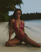 One piece bodysuit in burgundy metallic spandex, which ties up at the neck and hips.