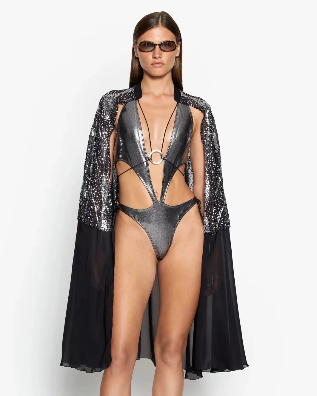For an amazing festival outfit, pair with AUMI Silver Sequin Cape.