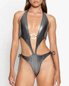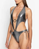 One piece bodysuit in dark silver metallic spandex, which ties up at the neck and hips.