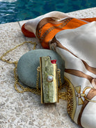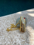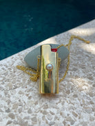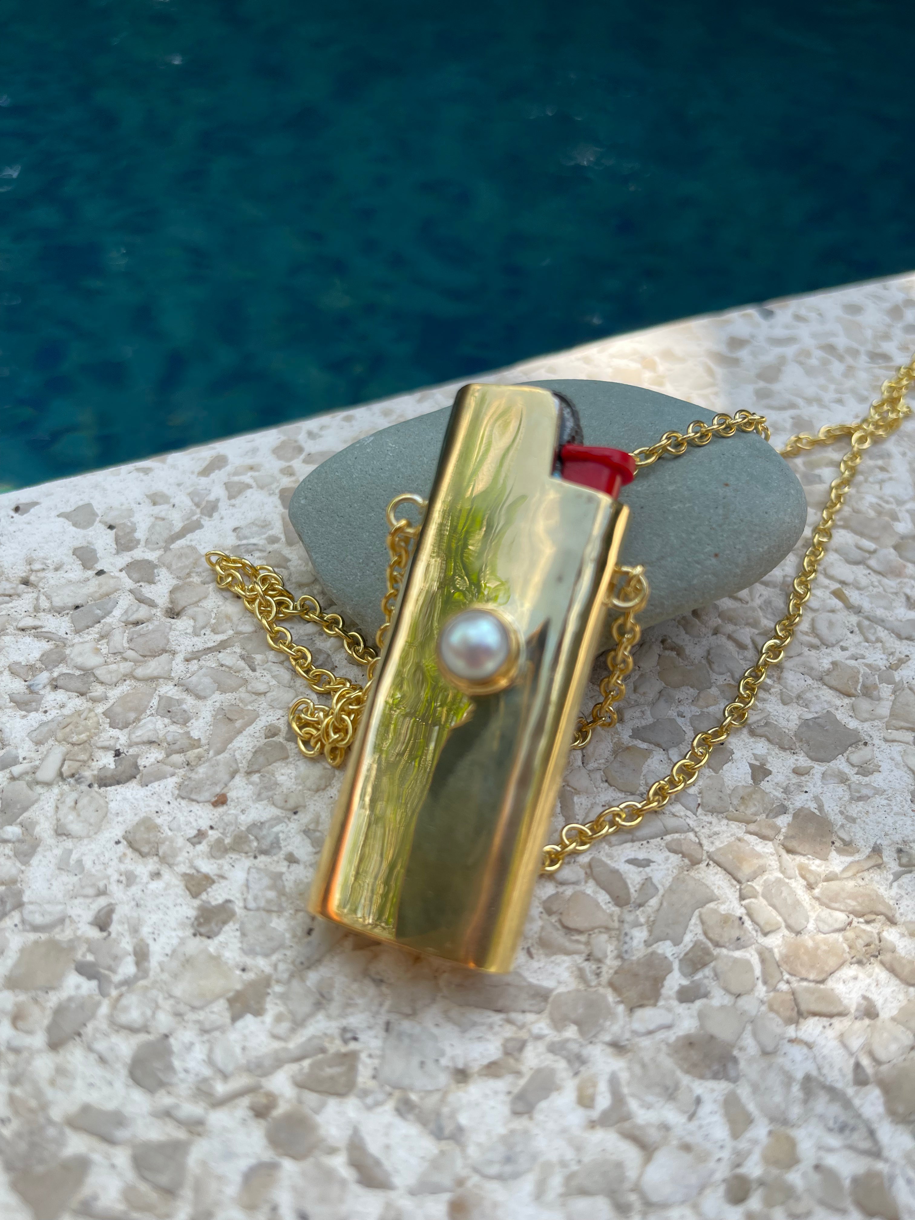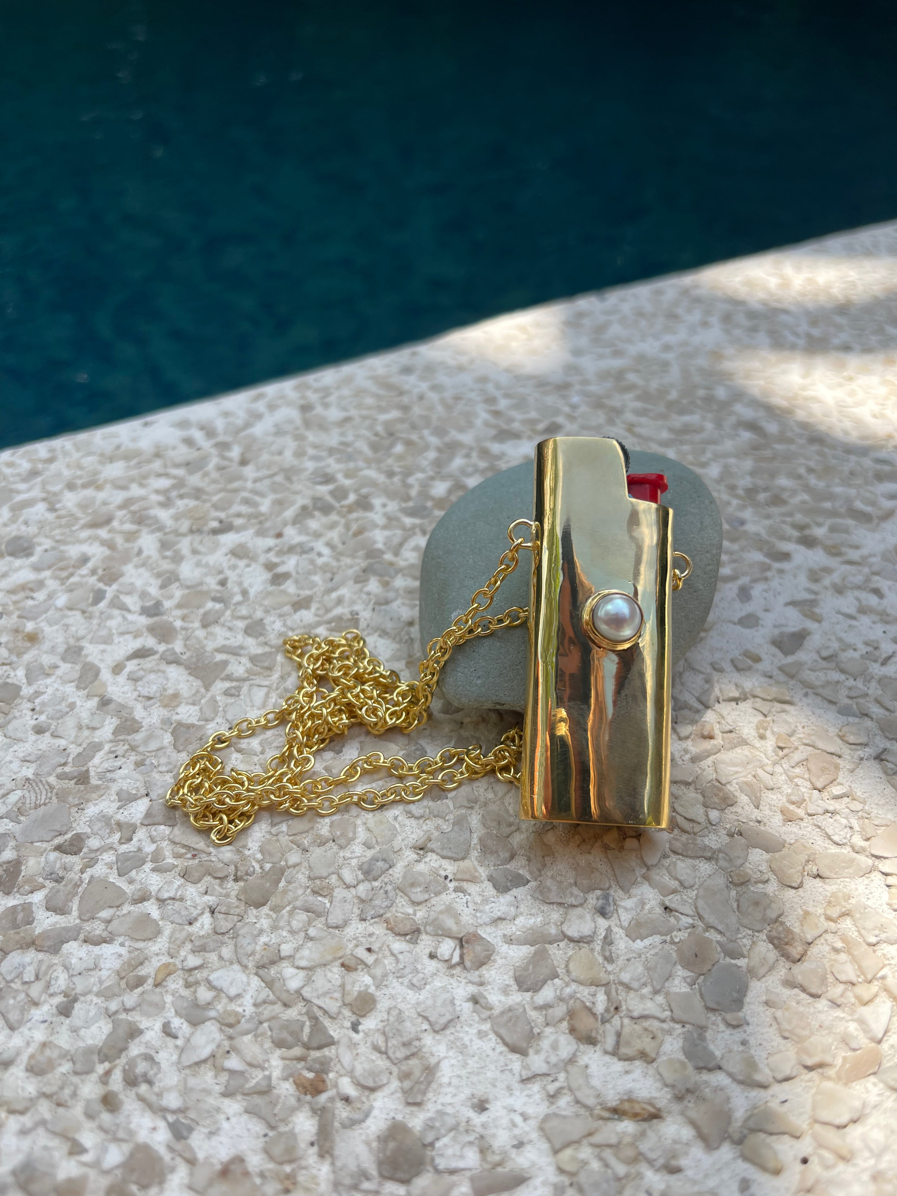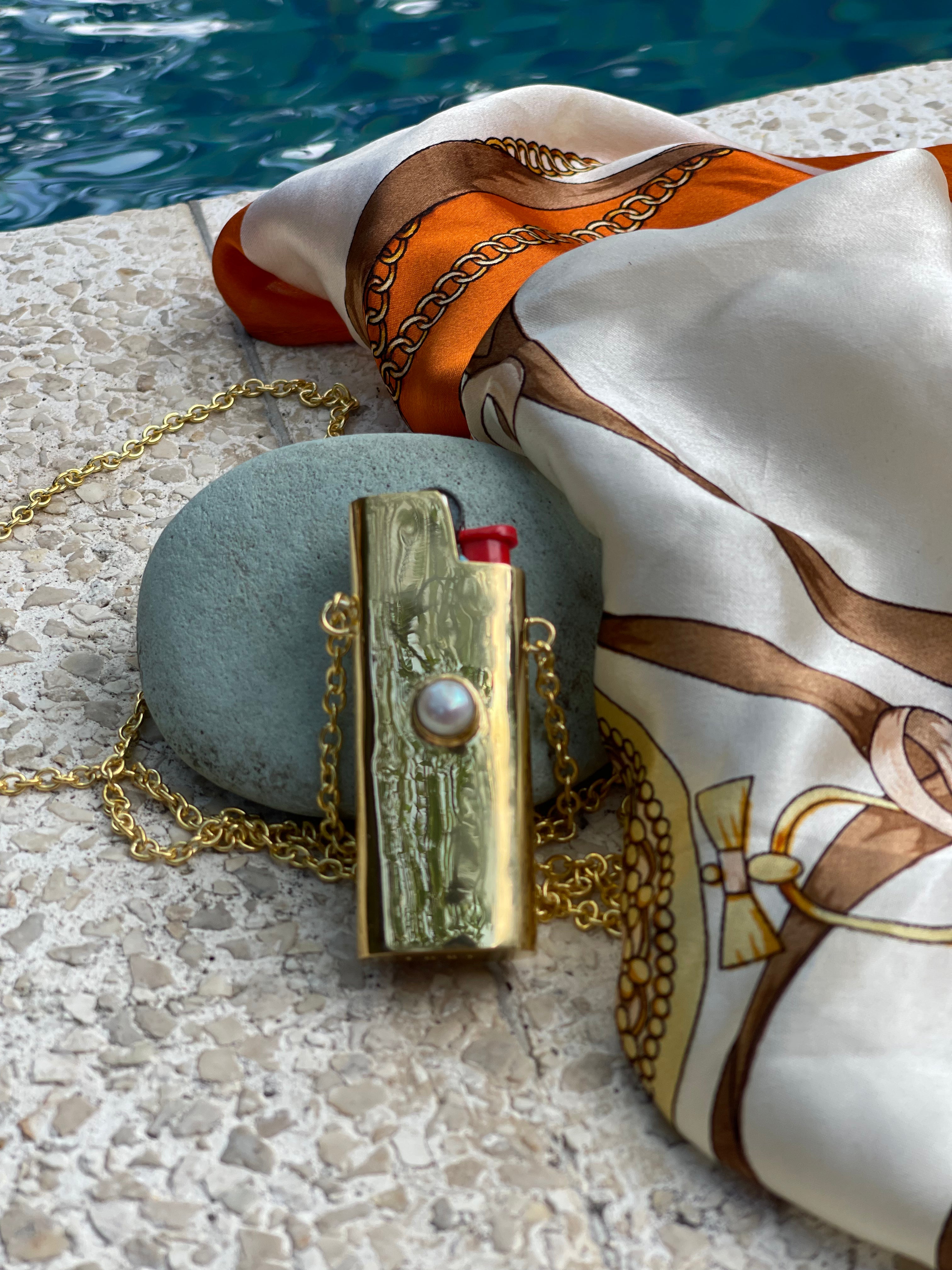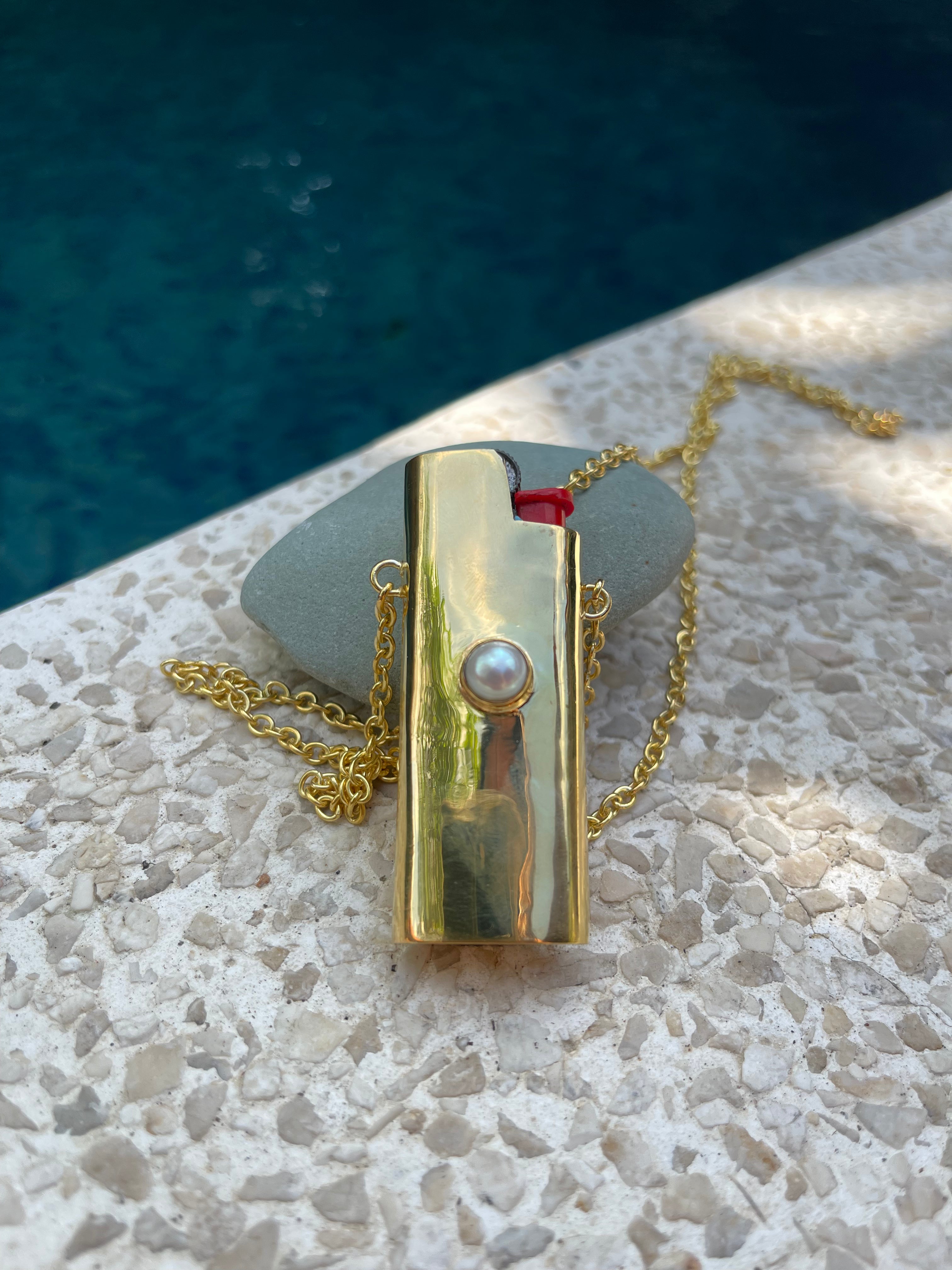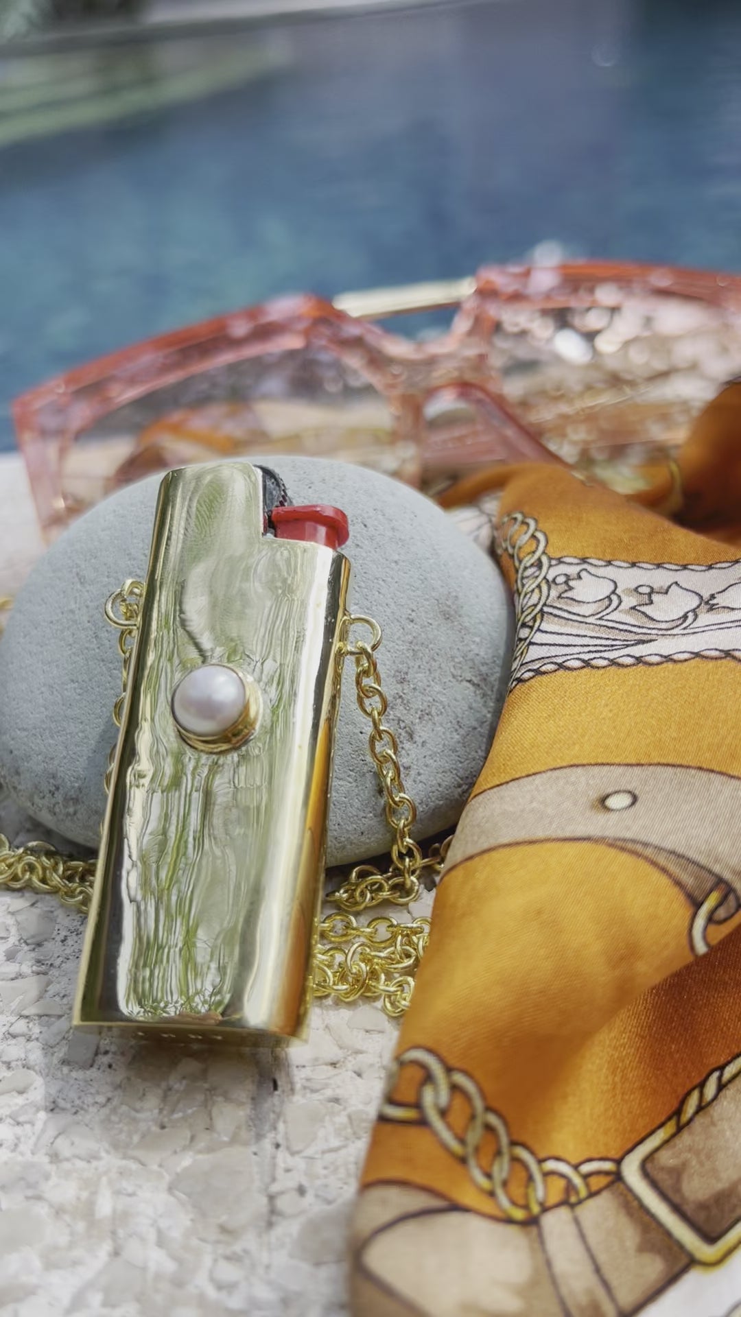 The perfect accessory for those who want to keep their lighter close and secure at festivals, parties, or events! This necklace is made of high-quality brass, is 18K gold plated and features a pearl on the front.