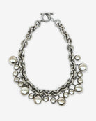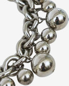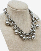 This authentic vintage Givenchy necklace from the 1980s is a bold and timeless statement piece, perfect for adding a touch of edgy sophistication to your look. Designed with a chunky silver-tone link chain, it features two sizes of ball pendants for a modern and striking aesthetic. Crafted from durable chromed metal with a gunmetal-inspired finish, it has a substantial weight that feels luxurious yet wearable.