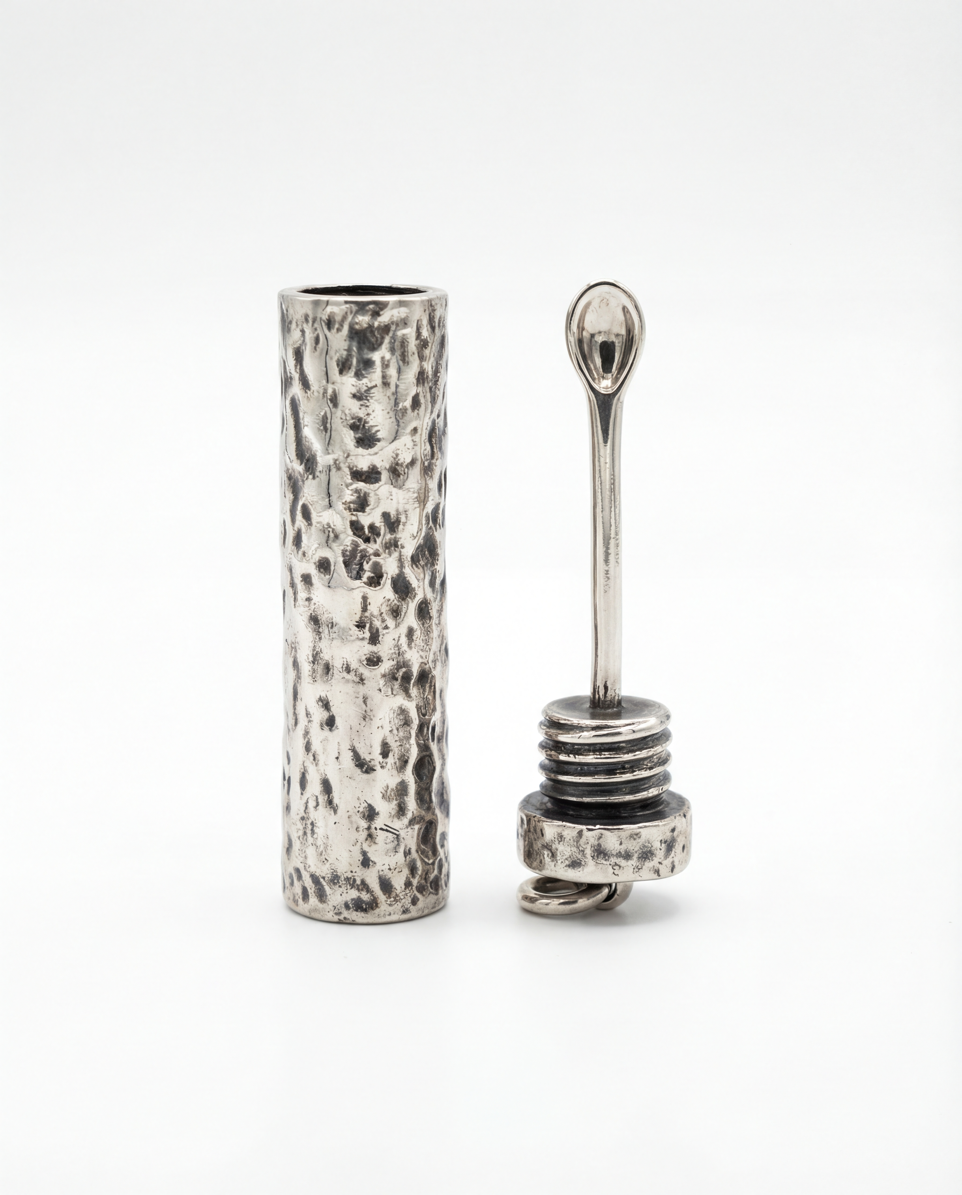 The Totem Spoon Necklace is a cylindrical pendant necklace designed as both a sculptural accessory and a discreet functional piece. Crafted in solid brass with a textured, worn-in finish, the pendant has a raw, object-like quality that feels architectural and intentional.