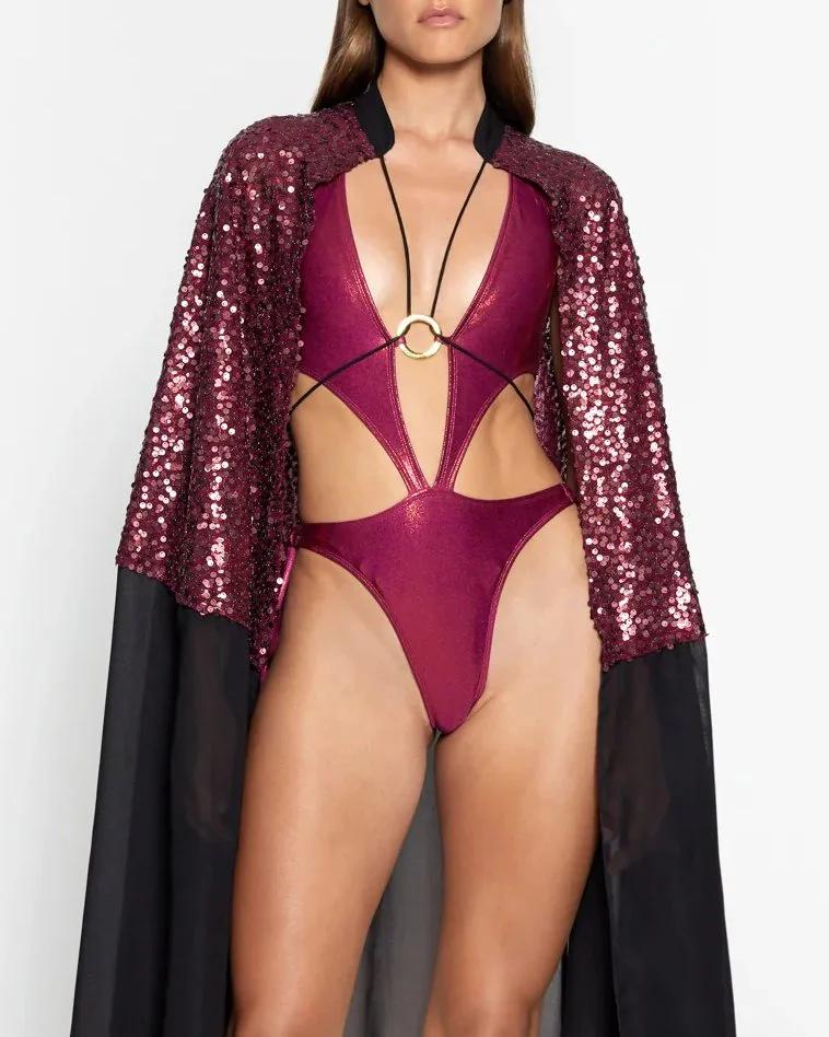 Burgundy sequin and black chiffon cape that drapes over the shoulders and can be tied up in multiple ways.