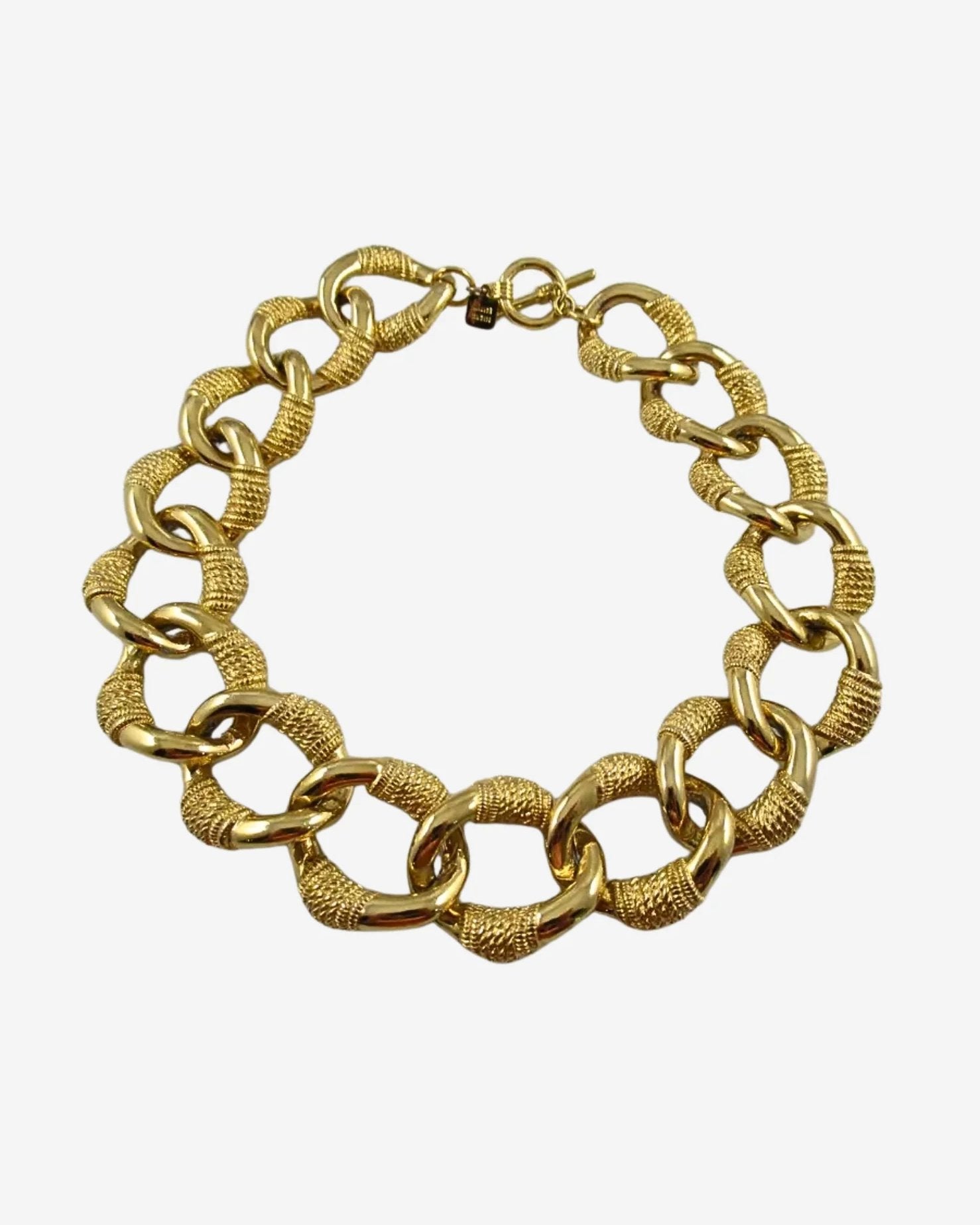 This bold vintage Anne Klein necklace is a true statement piece. Crafted in gold-tone metal, it features large, textured links that add depth and character to its striking design. Measuring 17 1/2 inches in length and 1 1/4 inches wide, this necklace sits beautifully on the neckline, making it perfect for adding a touch of drama to any outfit.