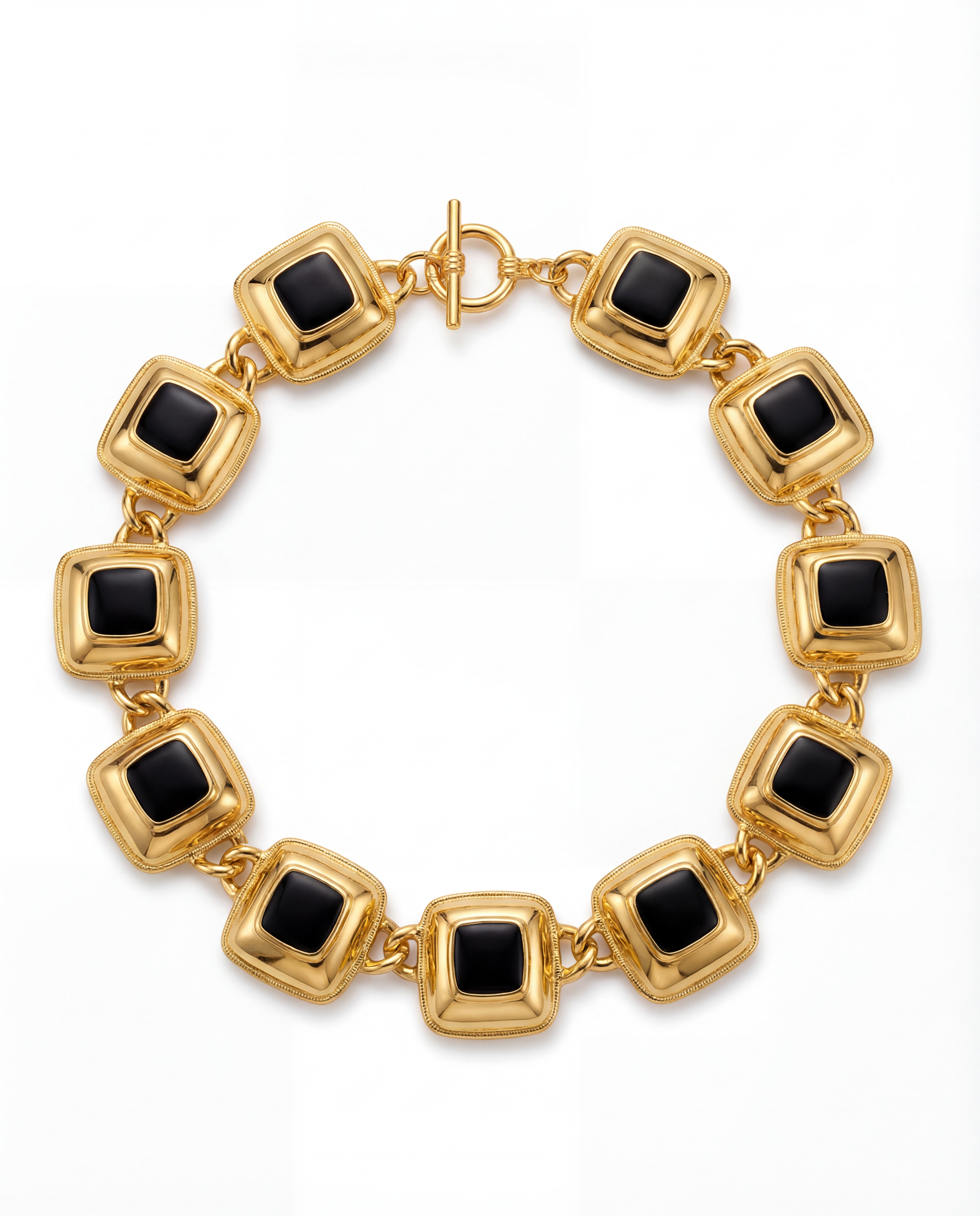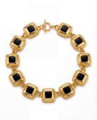 A sculptural vintage necklace composed of polished gold-tone links, each set with a glossy black tile. The squared silhouette gives the piece a bold, architectural feel that sits somewhere between statement and timeless.
