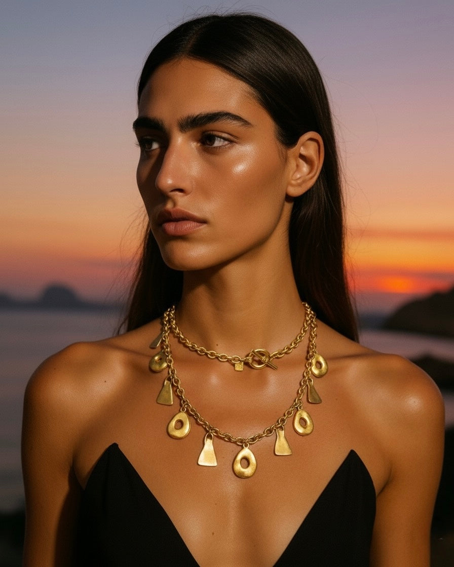 Each charm showcases intricate crosshatching detail on the back, highlighting the exceptional craftsmanship. Measuring approximately 17 inches in length, with 1 ½-inch charms, this collar-style necklace is perfect for adding a touch of drama to any look.