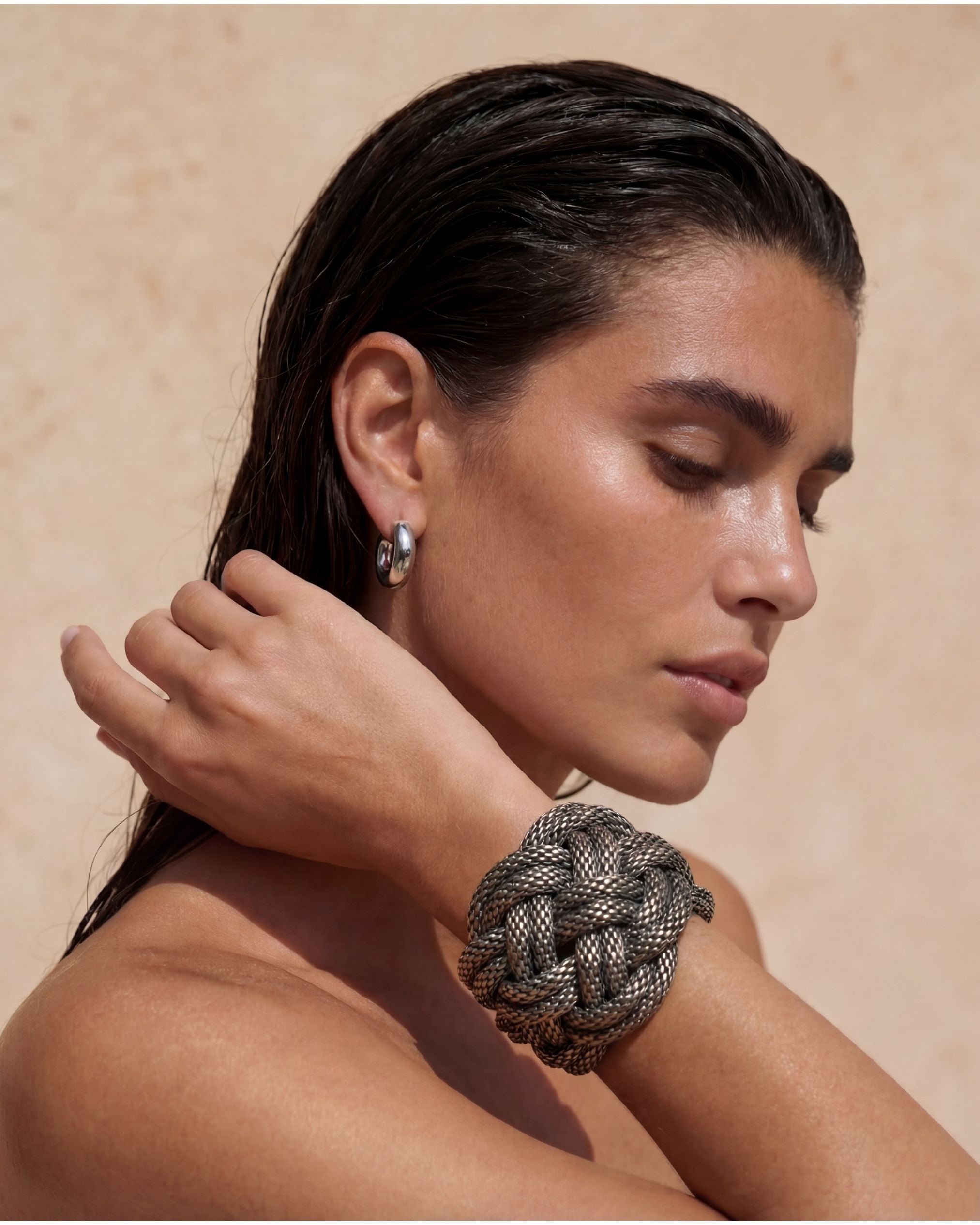This statement piece features an intricate woven metal design, knotted into a bold, architectural form. Solid, weighty, and beautifully tactile, it’s the kind of cuff that does all the talking, whether worn solo or stacked with something understated.