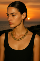 This vintage gold-tone necklace by Anne Klein is a timeless and versatile statement piece. Featuring a unique design of interlinked, patterned square shapes, it showcases intricate craftsmanship and a bold, geometric aesthetic.