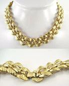 This vintage Monet gold-tone necklace combines timeless elegance with a touch of bold sophistication. Featuring a chain-style design with textured outer edges and smooth inner links, it offers a refined contrast that’s effortlessly chic.