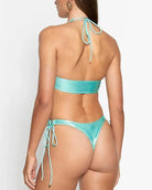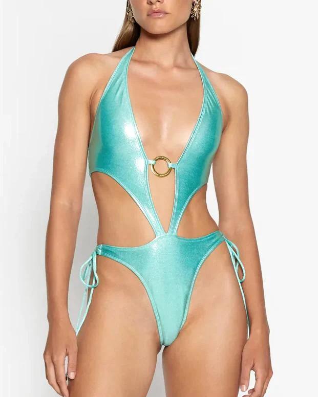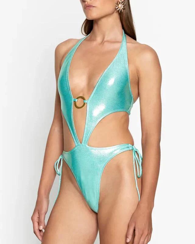 One piece bodysuit in aqua metallic spandex, which ties up at the neck and hips.