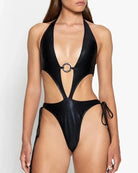 One piece bodysuit in black metallic spandex, which ties up at the neck and hips.