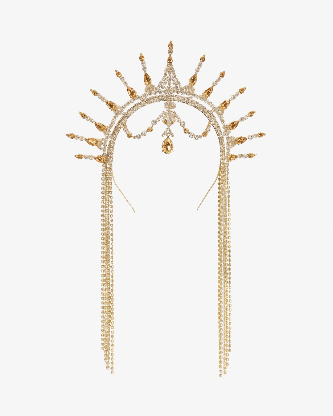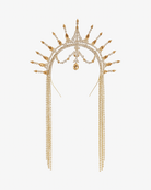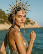 Turn heads from golden hour to moonlit nights with this show-stopping Celestial Sunburst Headdress. Handcrafted with cascading crystal strands and radiant gold-toned spikes, it’s designed to catch the light from every angle. The intricate crown features a delicate teardrop centerpiece that frames the face, while the draped crystal chains create movement and drama with every step.