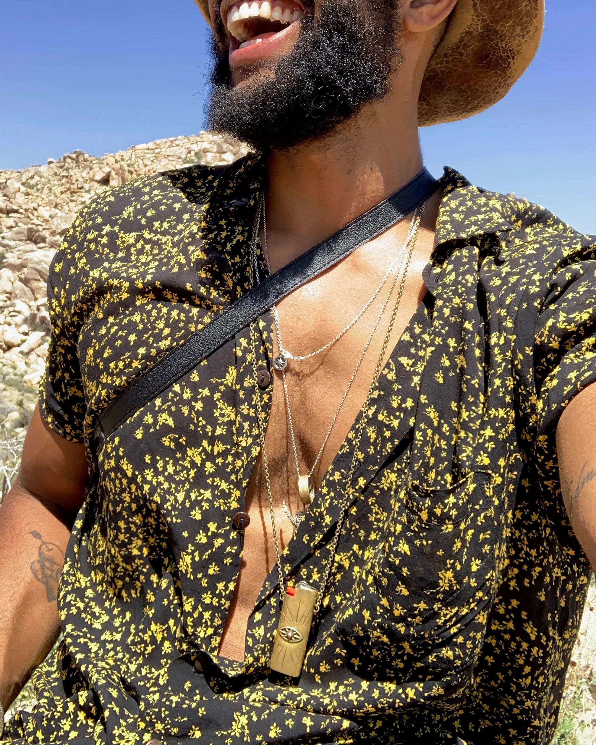 The necklace Hangs 18 inches long, which is long enough to light someone else's cigarette, joint or palo santo stick without having to take it off!