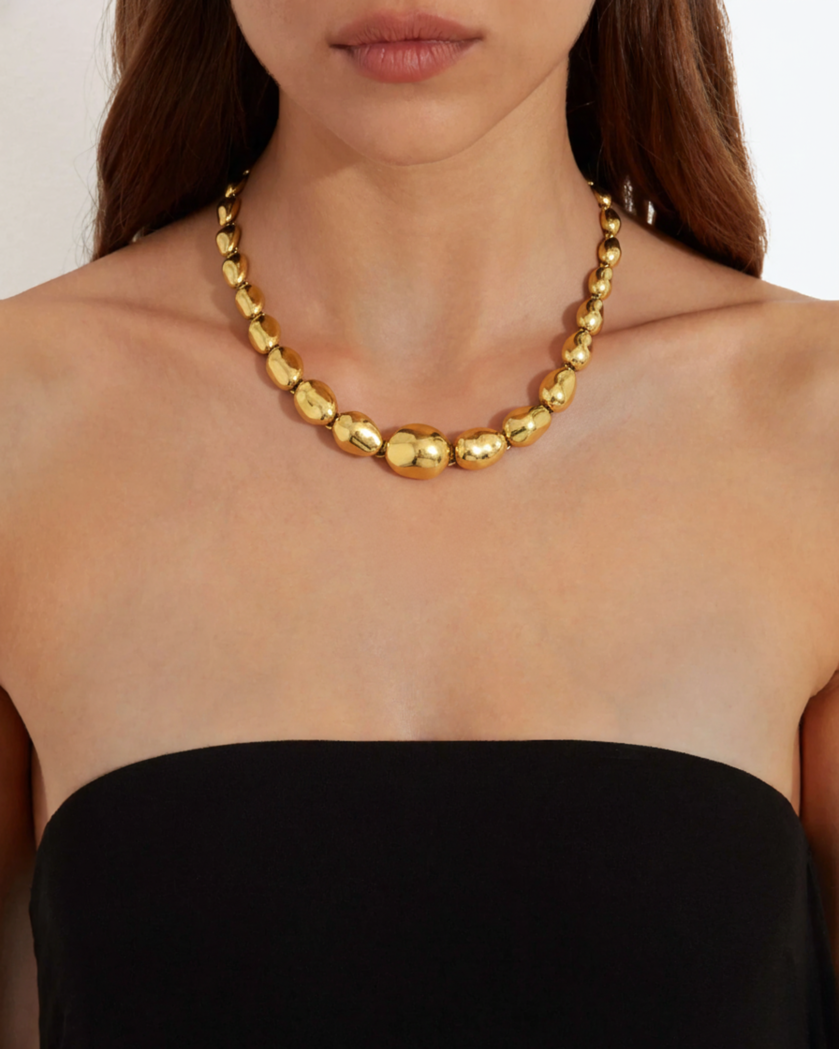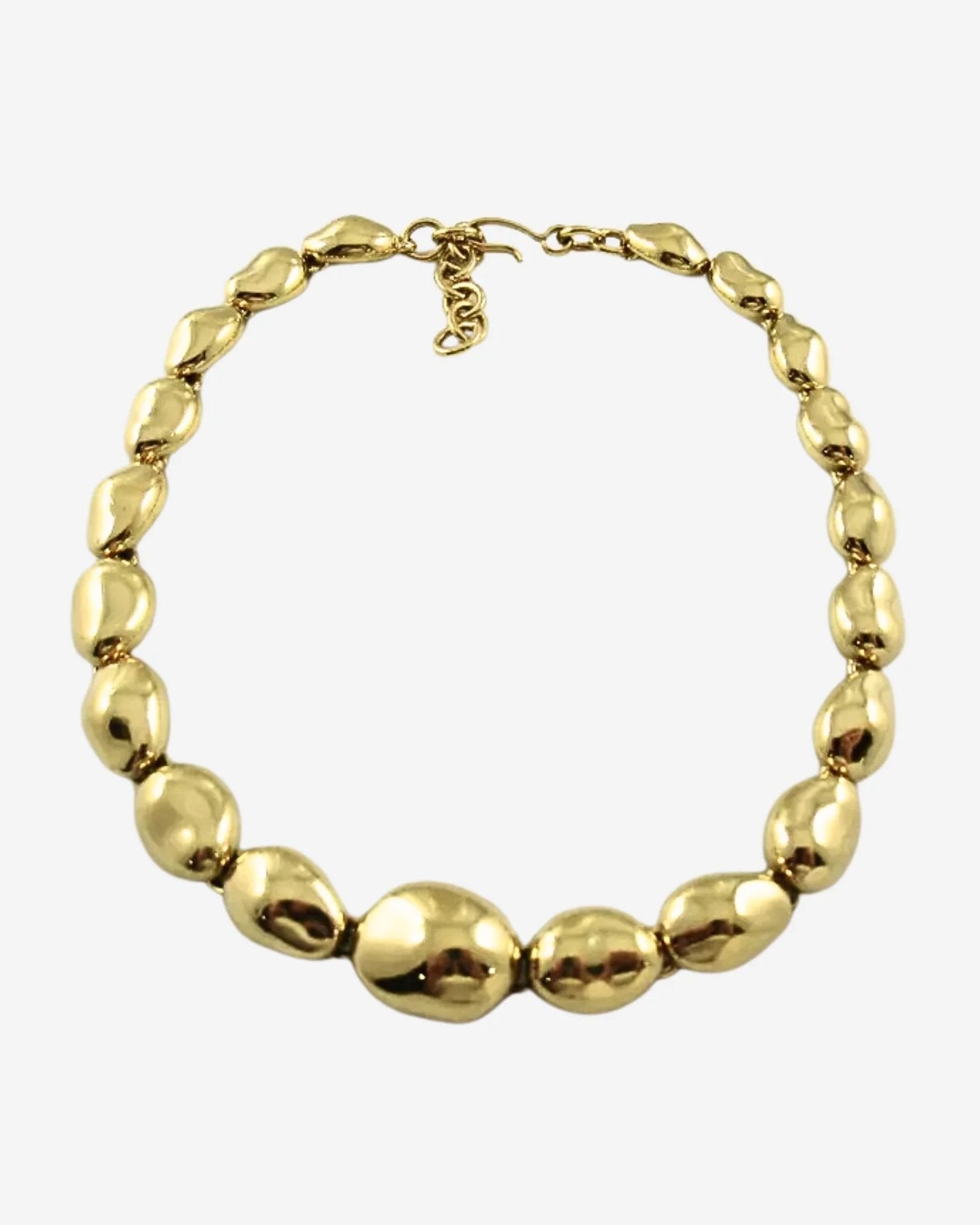 This elegant Monet gold-tone necklace features a unique design of bean-shaped links in varying sizes, creating a sleek and modern aesthetic. The center link, slightly wider at 5/8 inch, adds a subtle focal point to the piece.
